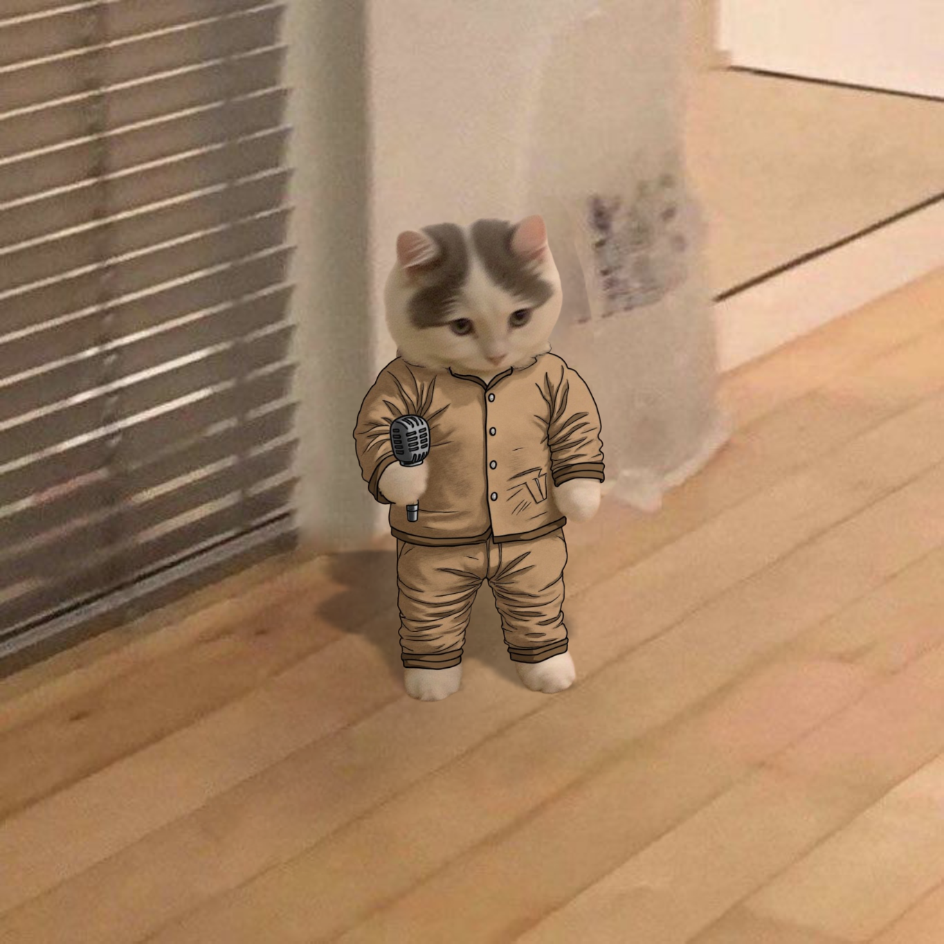 The feline rockstar takes center stage, mic in paw, channeling iconic 80s energy.