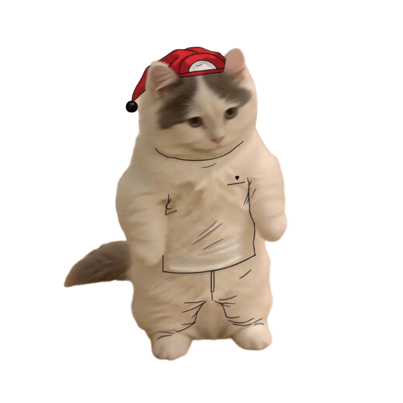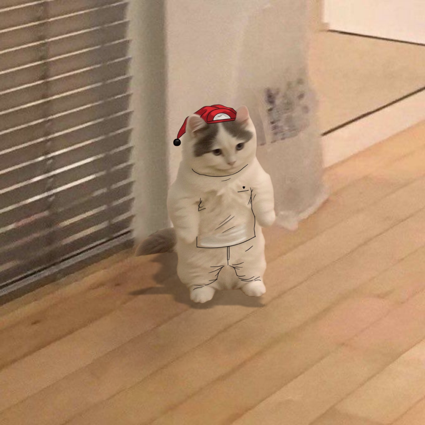 Michi dons an adorable pajama ensemble, ready for a kitty slumber bash in the iconic room.