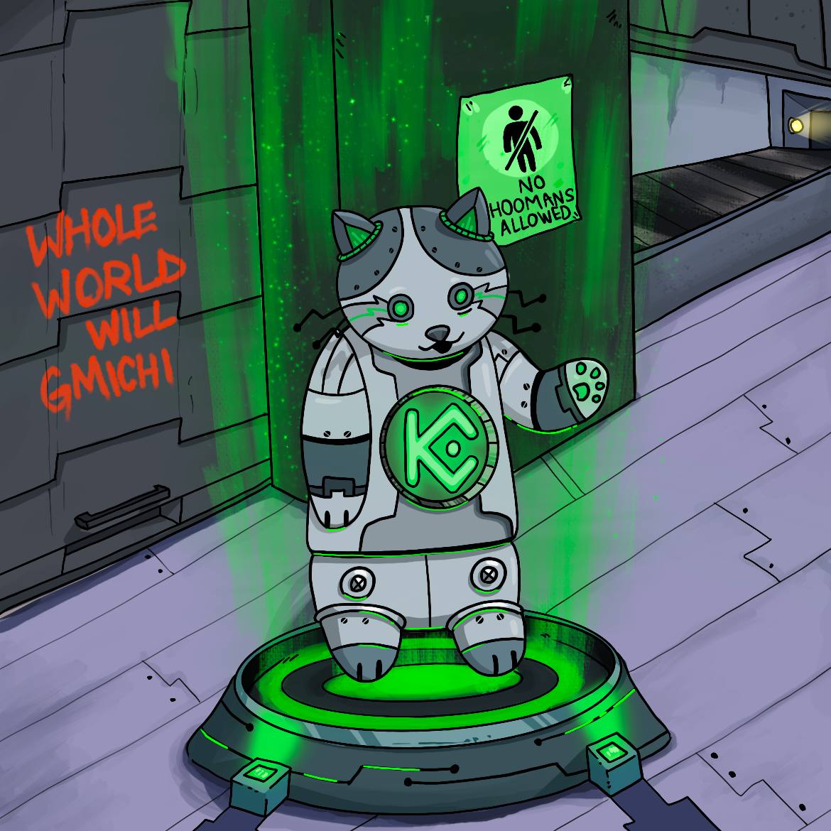 In a world where hoomans are banned, Michi leads the cyber uprising from a glowing green command center.