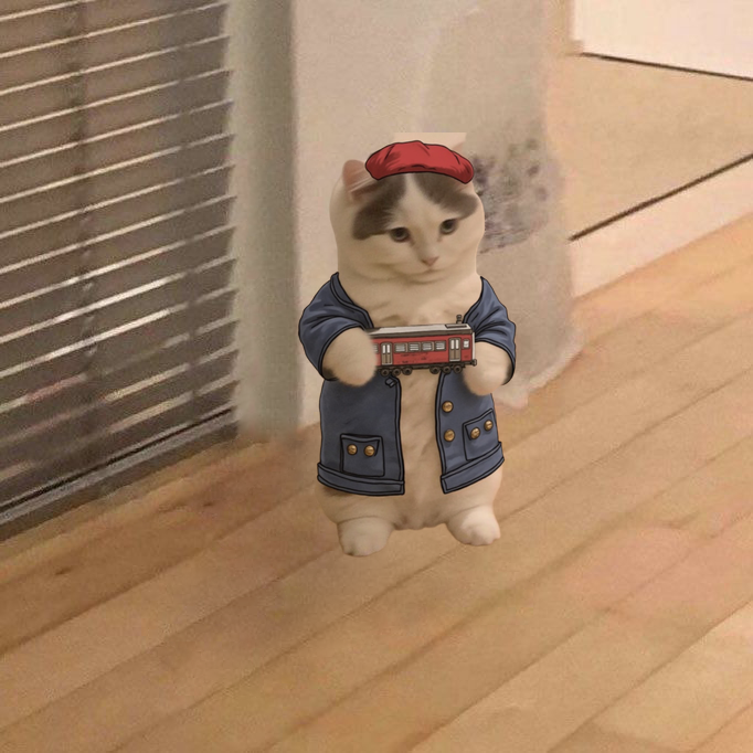 Michi dons a conductor hat and jacket, ready to embark on a paw-some journey with his toy train.